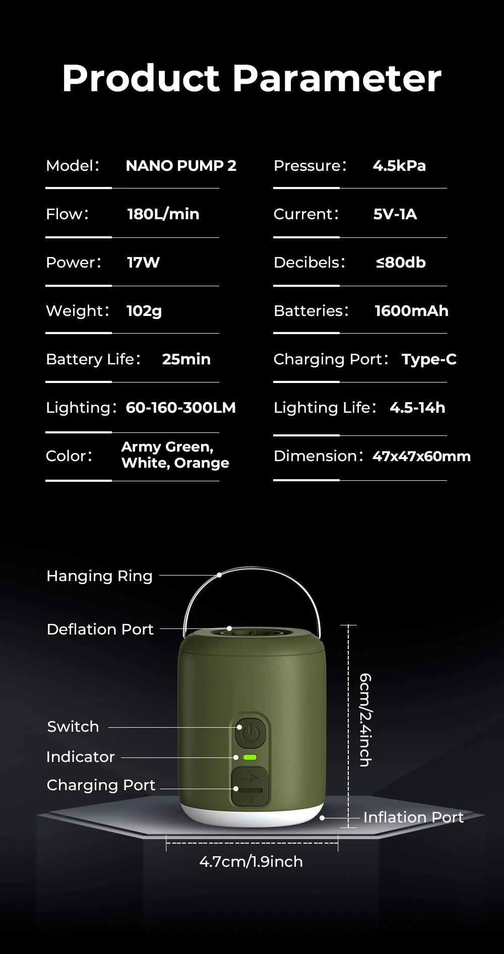 The HENGDUAN Portable Air Pump is a compact and versatile tool for all your outdoor and home needs. Designed with USB-C charging for fast and convenient recharging. Functions as both a powerful air inflator and a handy camping light. Easily inflates sleeping pads, air mattresses, and vacuum bags within minutes. The built-in LED light provides bright illumination for tents and night use. Lightweight and pocket-sized, it’s perfect for camping, hiking, and travel. Long-lasting battery ensures reliable performance on extended trips. Simple one-button operation for effortless inflation and deflation. Durable construction withstands outdoor environments and frequent use. Save time and space with this multifunctional portable air pump and camping light combo.